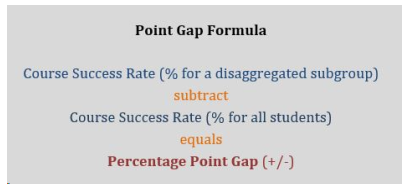 Equity gaps are identified using a statistical approach known as the percentage point gap method. This method allows institutions to compare outcomes (course success rates) between disaggregated student subgroups and a reference or comparison group. This comparison group is often the overall student population or the highest-performing group. The percentage point gap method makes it possible to “compare the course success rate for a disaggregated subgroup to the course success rate for a comparison group.”